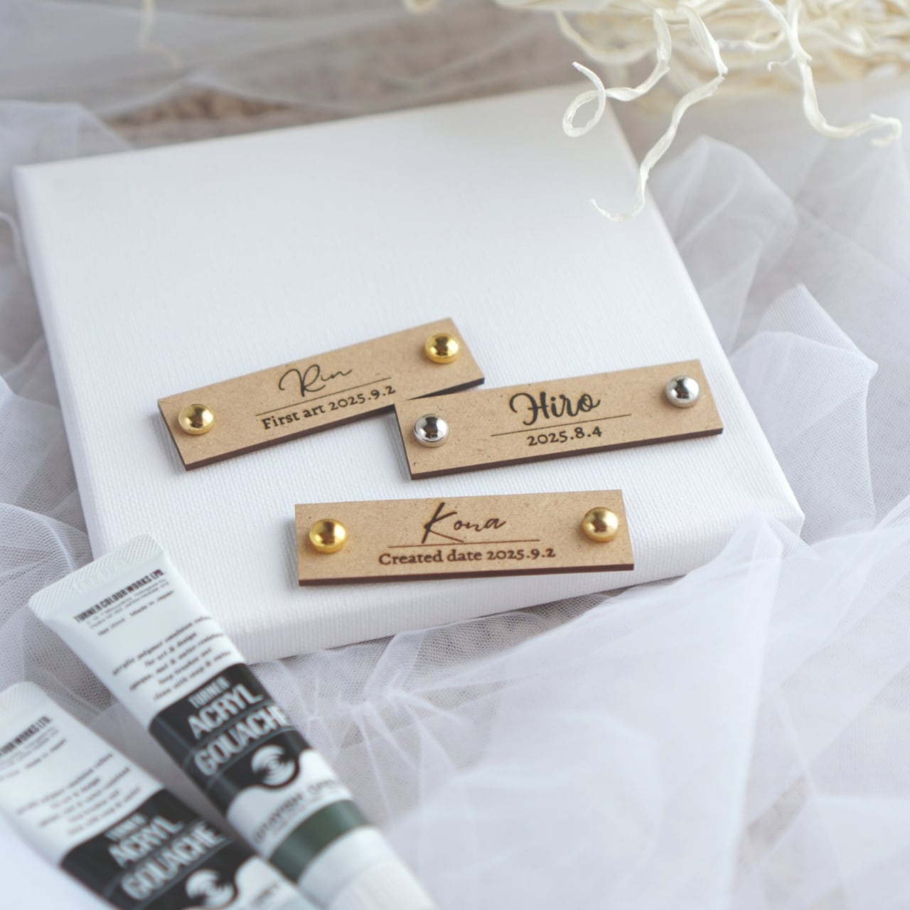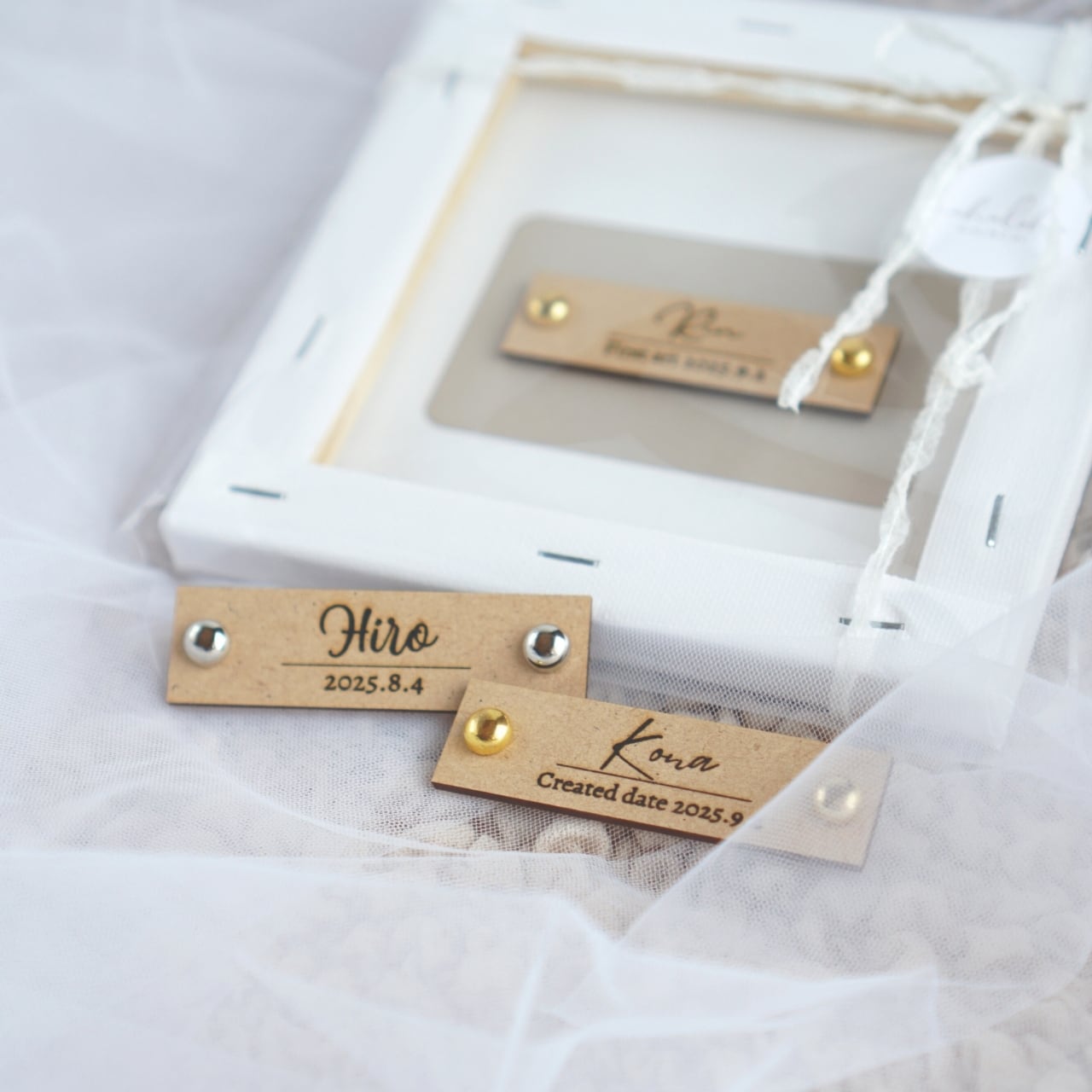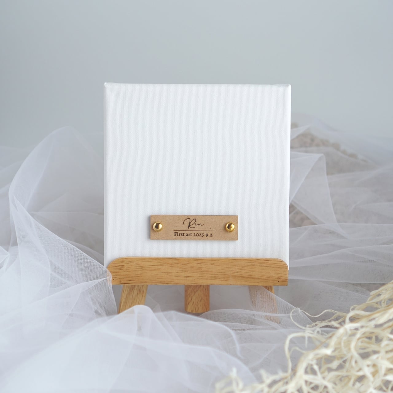 赤ちゃんの初めてのアート体験をお手伝いする、キャンバスとレーザー刻印したお名前プレートのセットです。