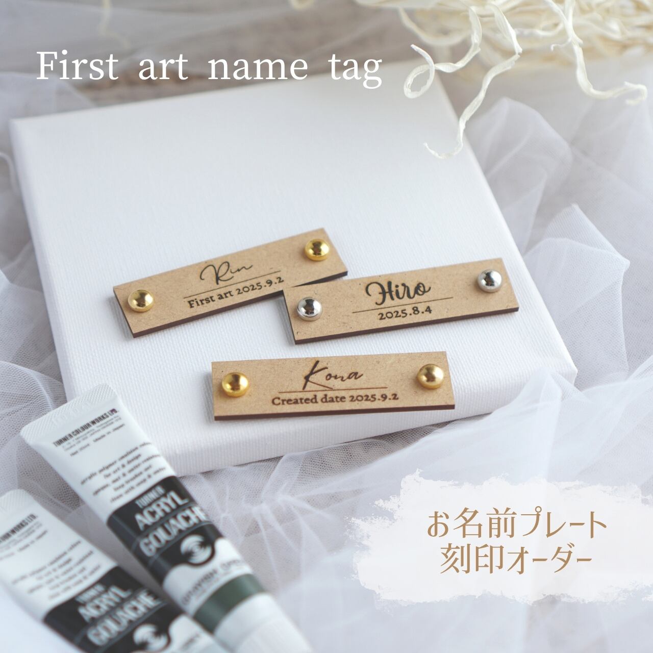 赤ちゃんの初めてのアート体験をお手伝いする、レーザー刻印したお名前プレートです。