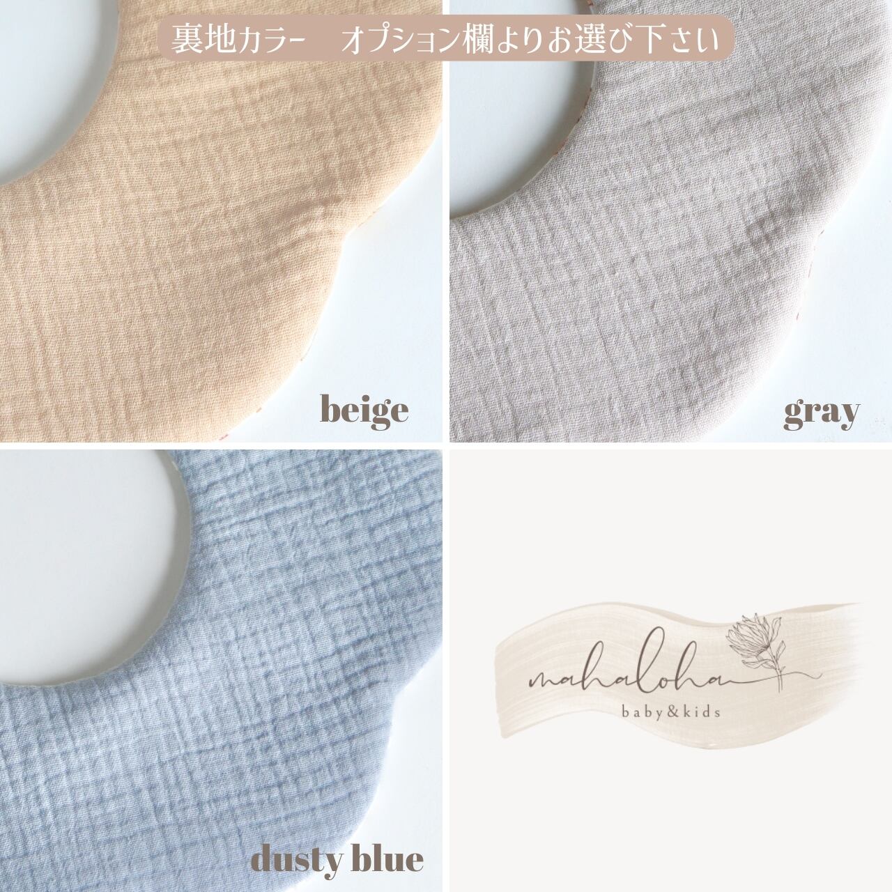 表地はコットン100%生地、中地はふかふか厚手のドミット芯(綿を圧縮させた生地)、裏地にはコットン100%のふわふわ加工ダブルガーゼを使用し、4層構造でよだれの多い赤ちゃんにも安心してお使い頂けます。